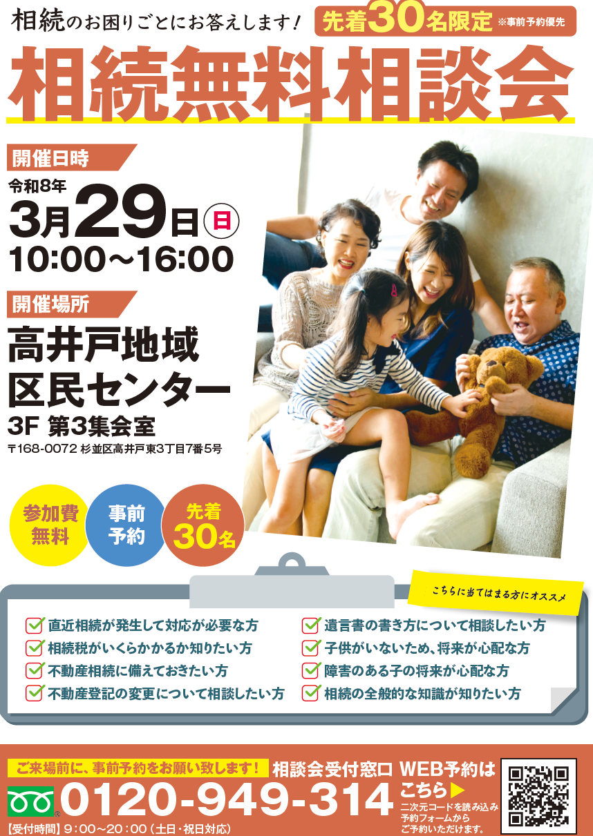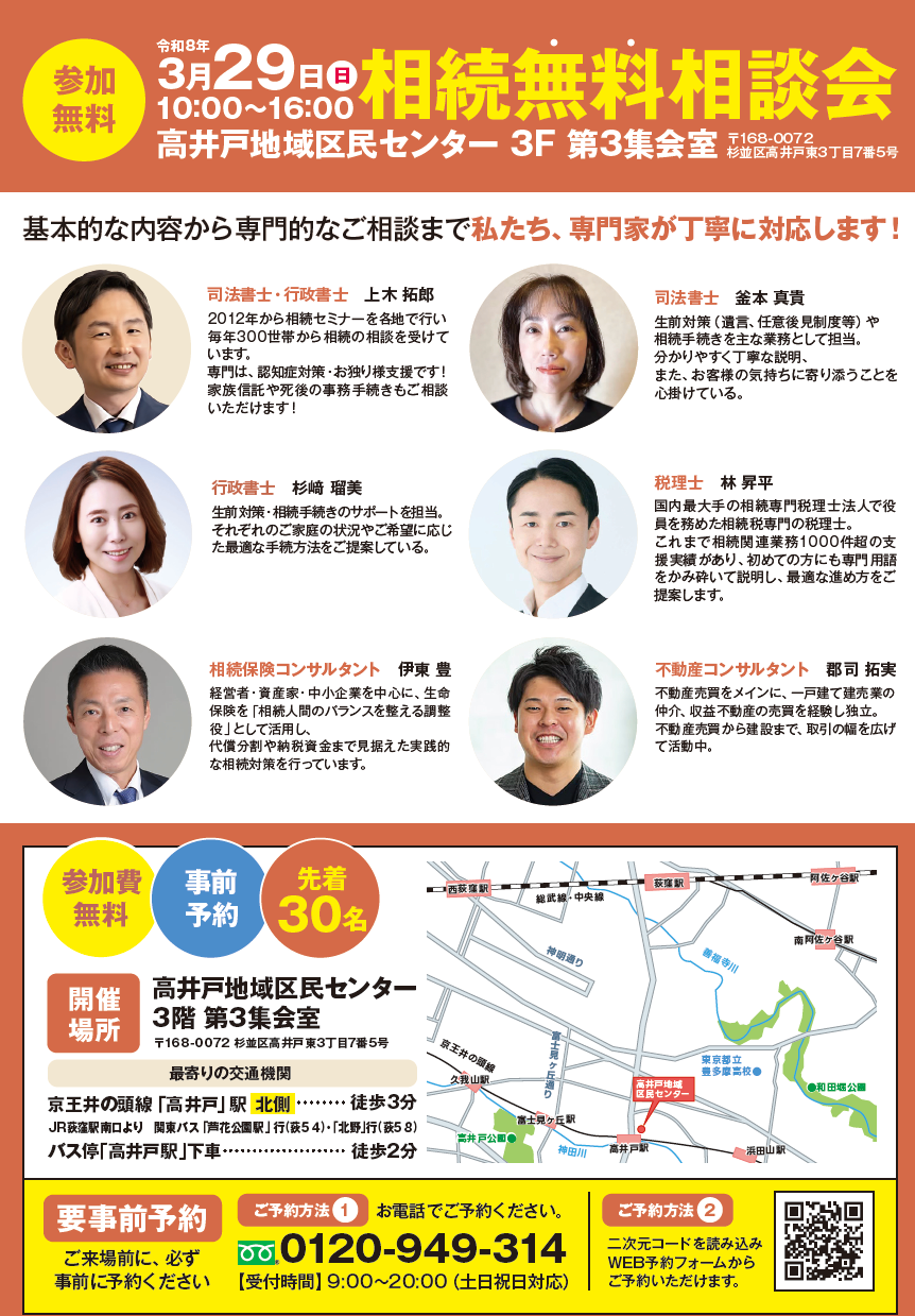 今回の相談会では、税理士・司法書士・行政書士・相続保険コンサルタント・不動産コンサルタントが連携し、基本的な内容から専門的なご相談まで丁寧に対応いたします。