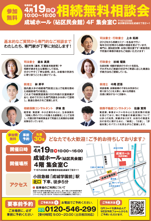 このたび、成城ホール(砧区民会館)にて、相続無料相談会を開催いたします。