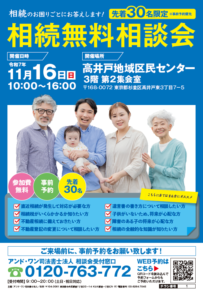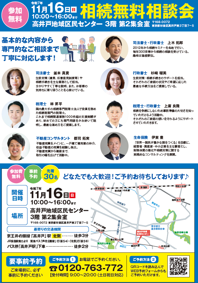 相続無料相談会|11/16(日) 高井戸地域区民センター【先着30名・参加無料】